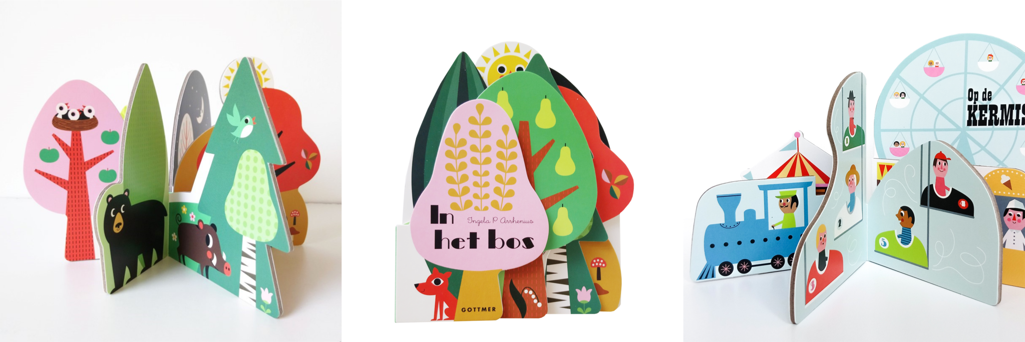 Begin dit jaar kwamen 2 hele leuke nieuwe boekjes uit, “in het bos” en “op de kermis“. Bij deze boekjes heeft elke pagina zijn eigen vorm. Dit maakt het extra leuk om door te bladeren, maar je kunt het boekjes hierdoor ook leuk neerzetten, als hij niet wordt bekeken.